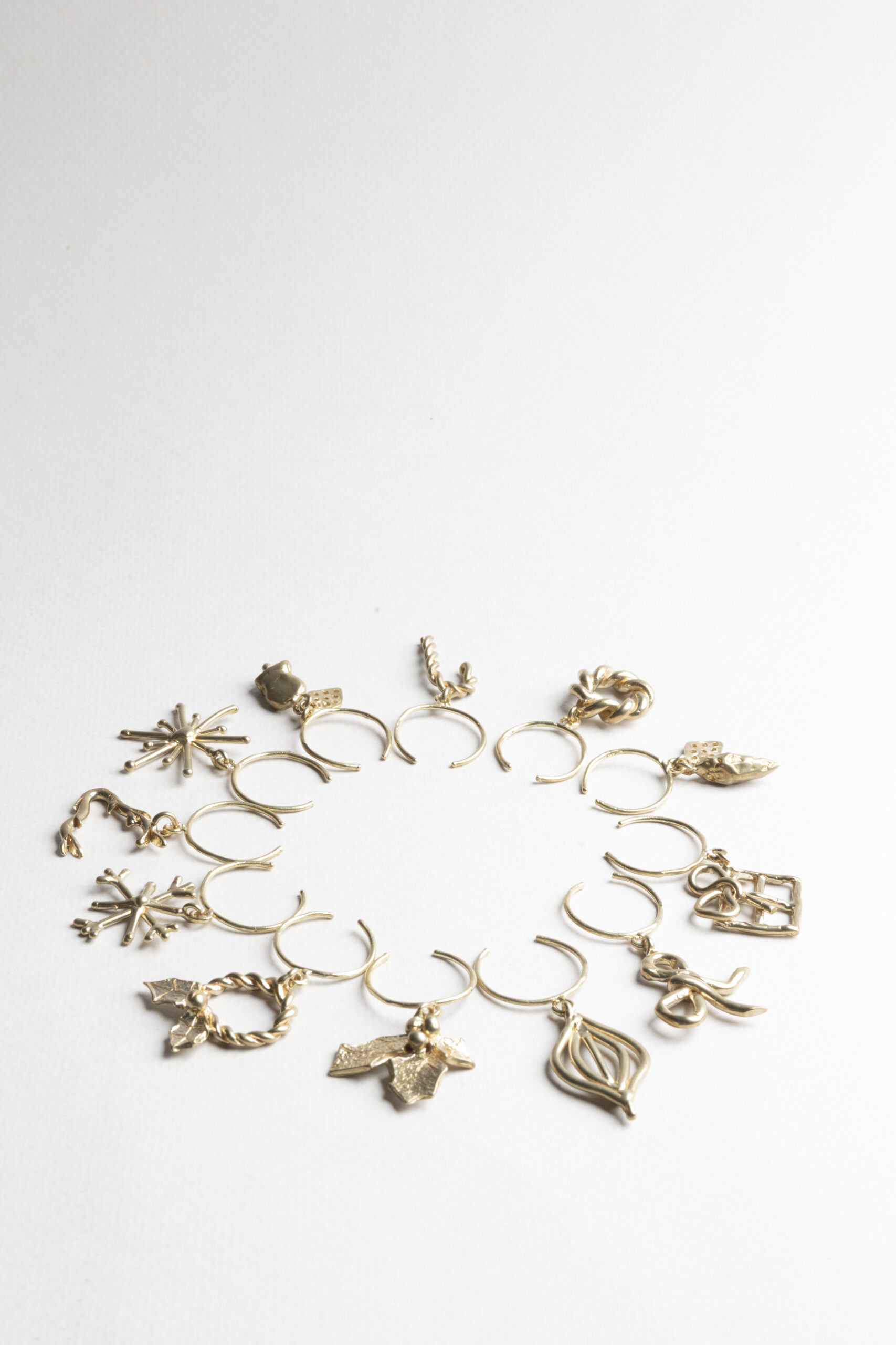 Set di segnabicchieri in ottone, ispirati al Natale. Possibilità di richiederli anche in bronzo o in finitura  color platino.