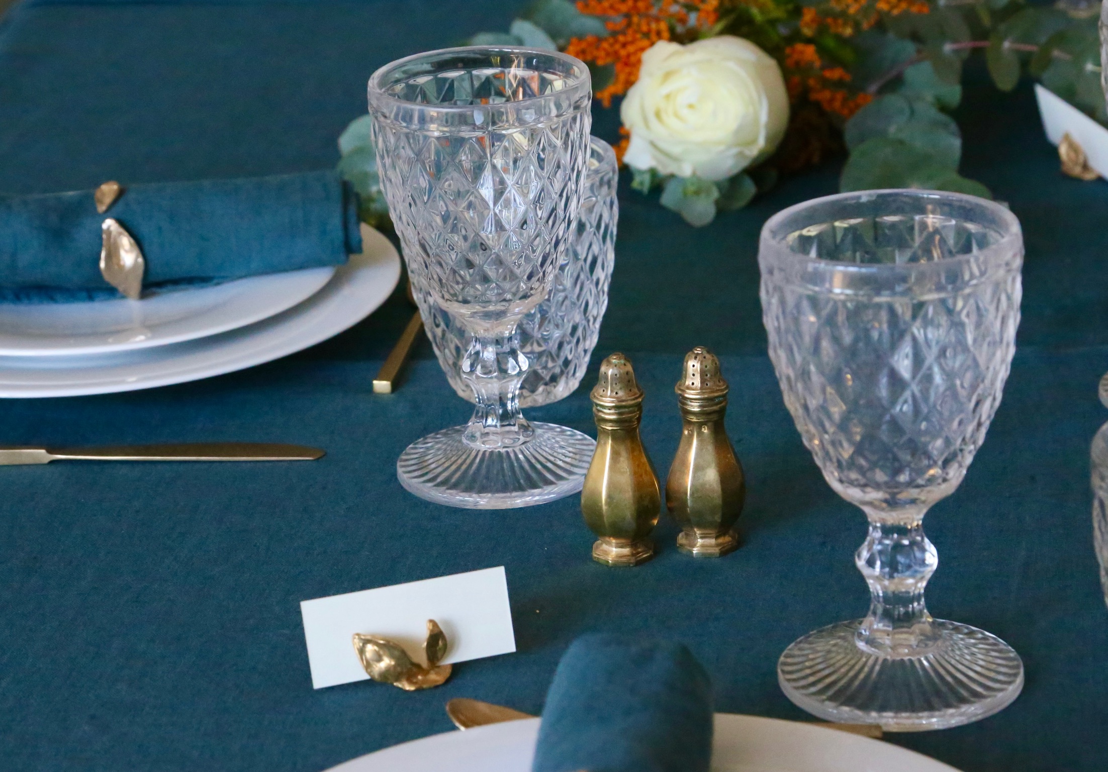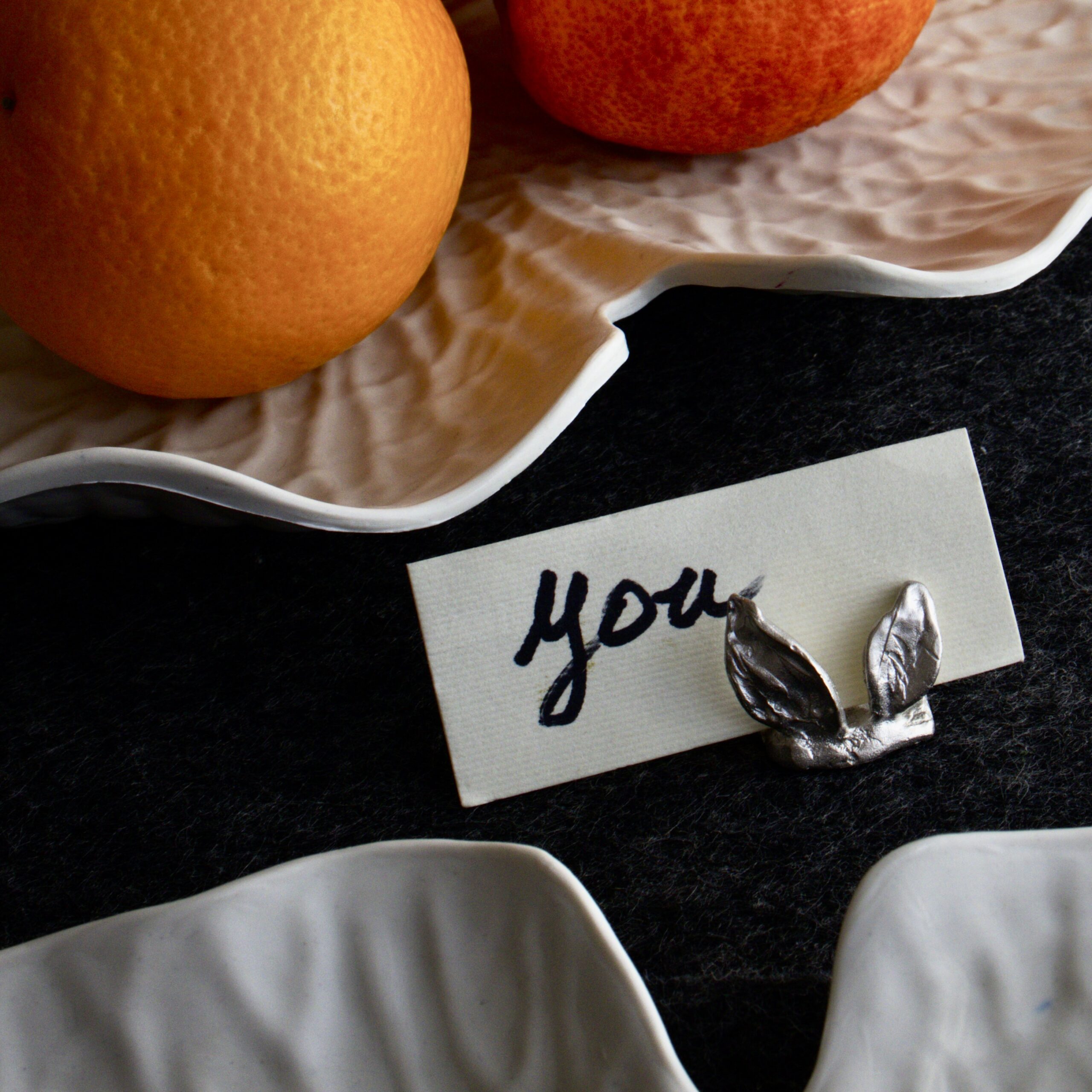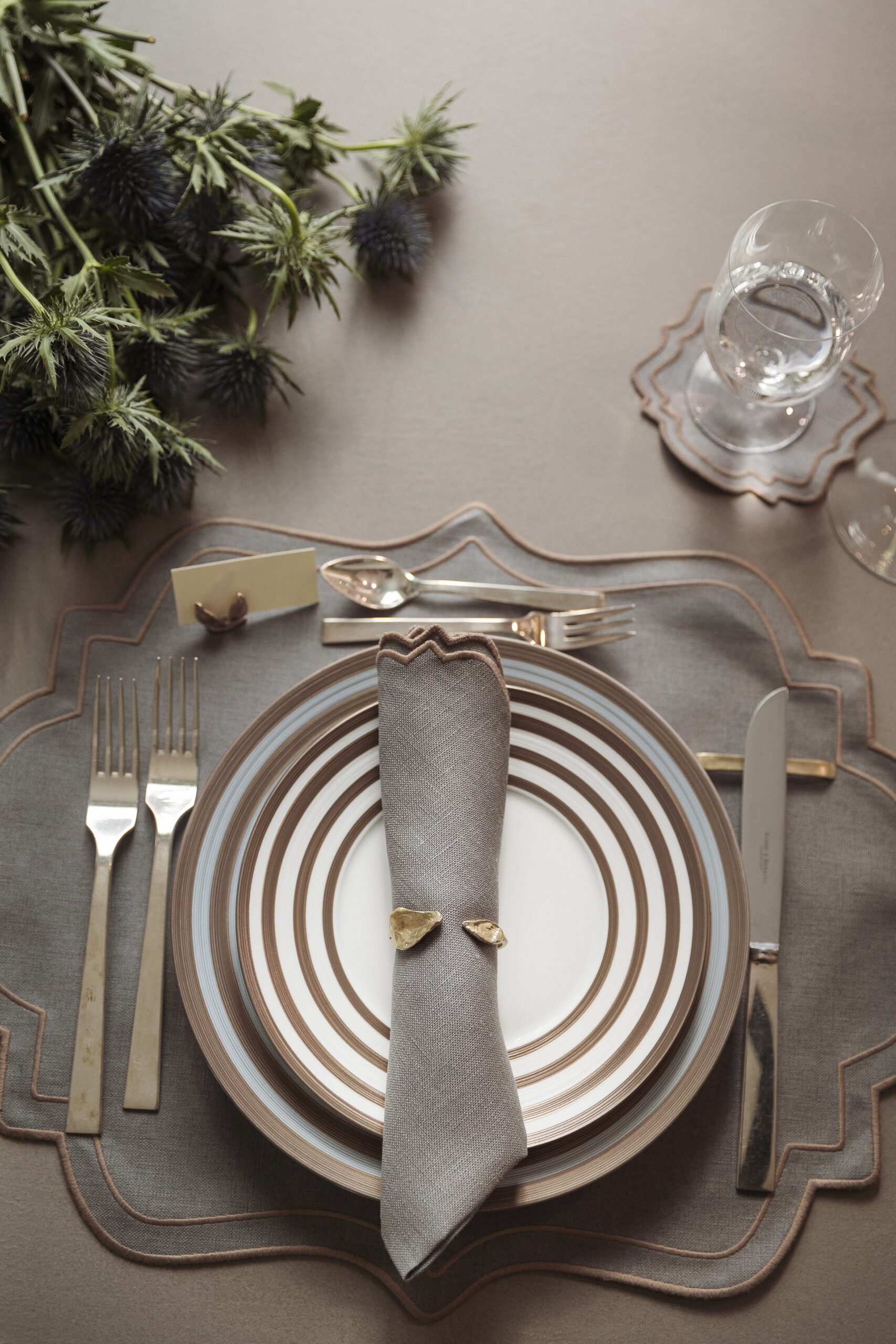 Set di segnaposto realizzati in bronzo con cartoncino in color avorio. Possibilità di finitura anche in color platino.