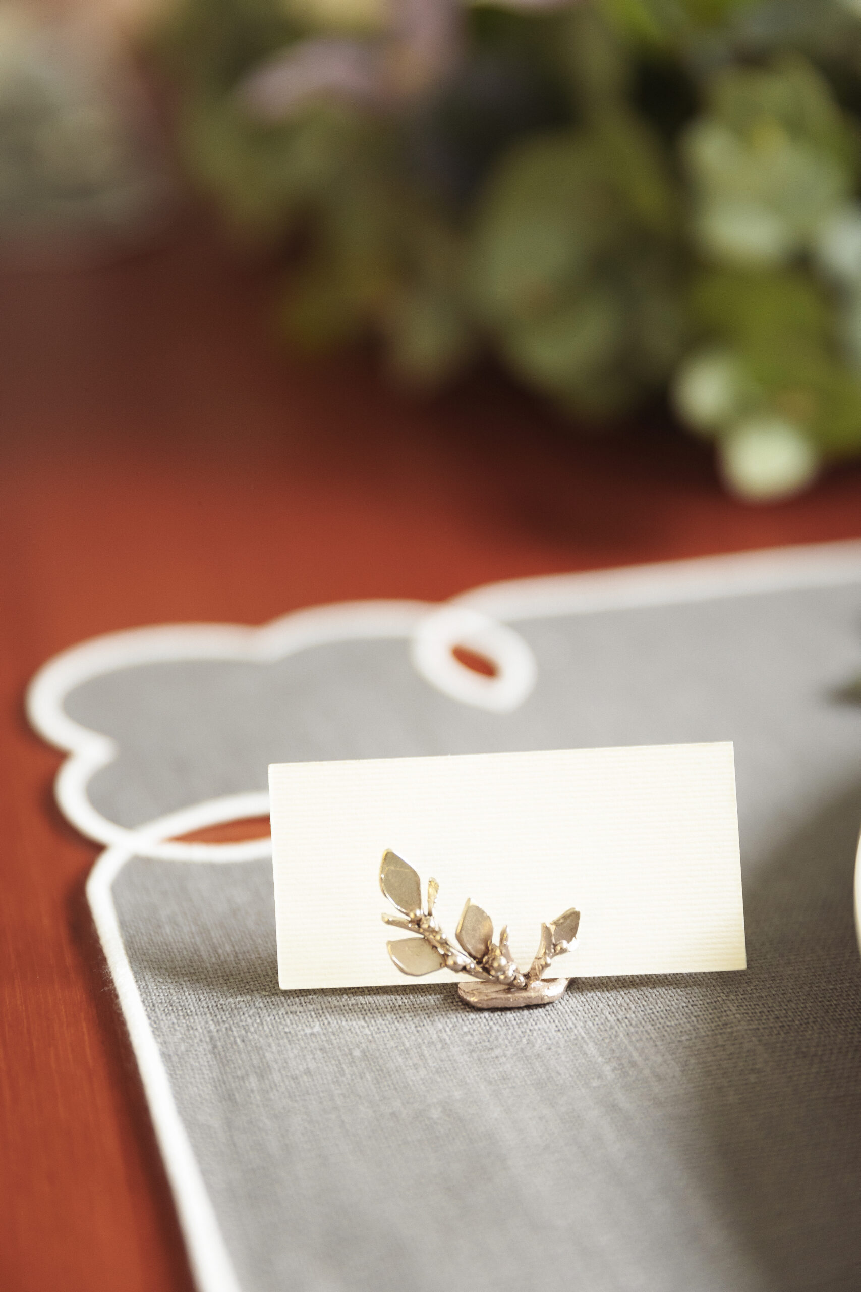 Set di segnaposto realizzati in bronzo con cartoncino in color avorio. Possibilità di finitura anche in color platino.