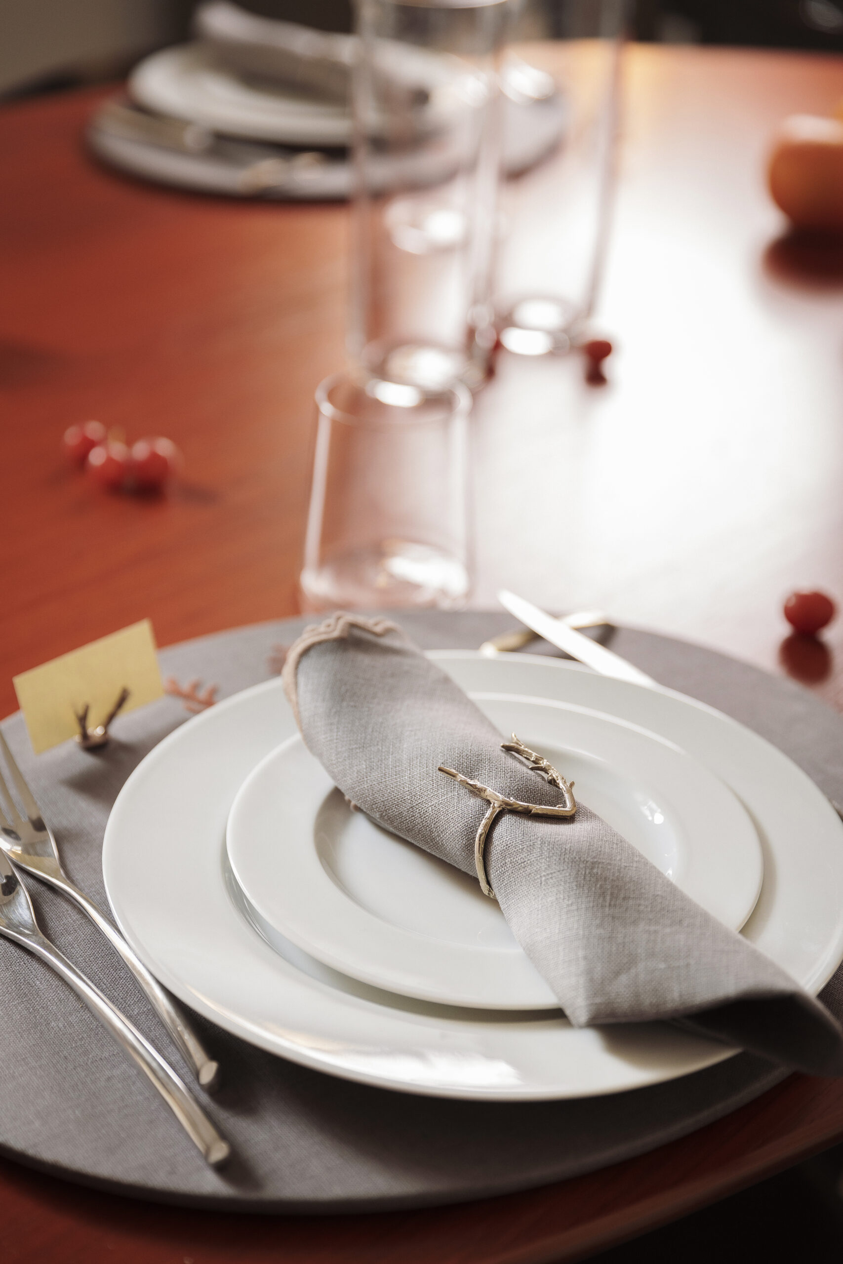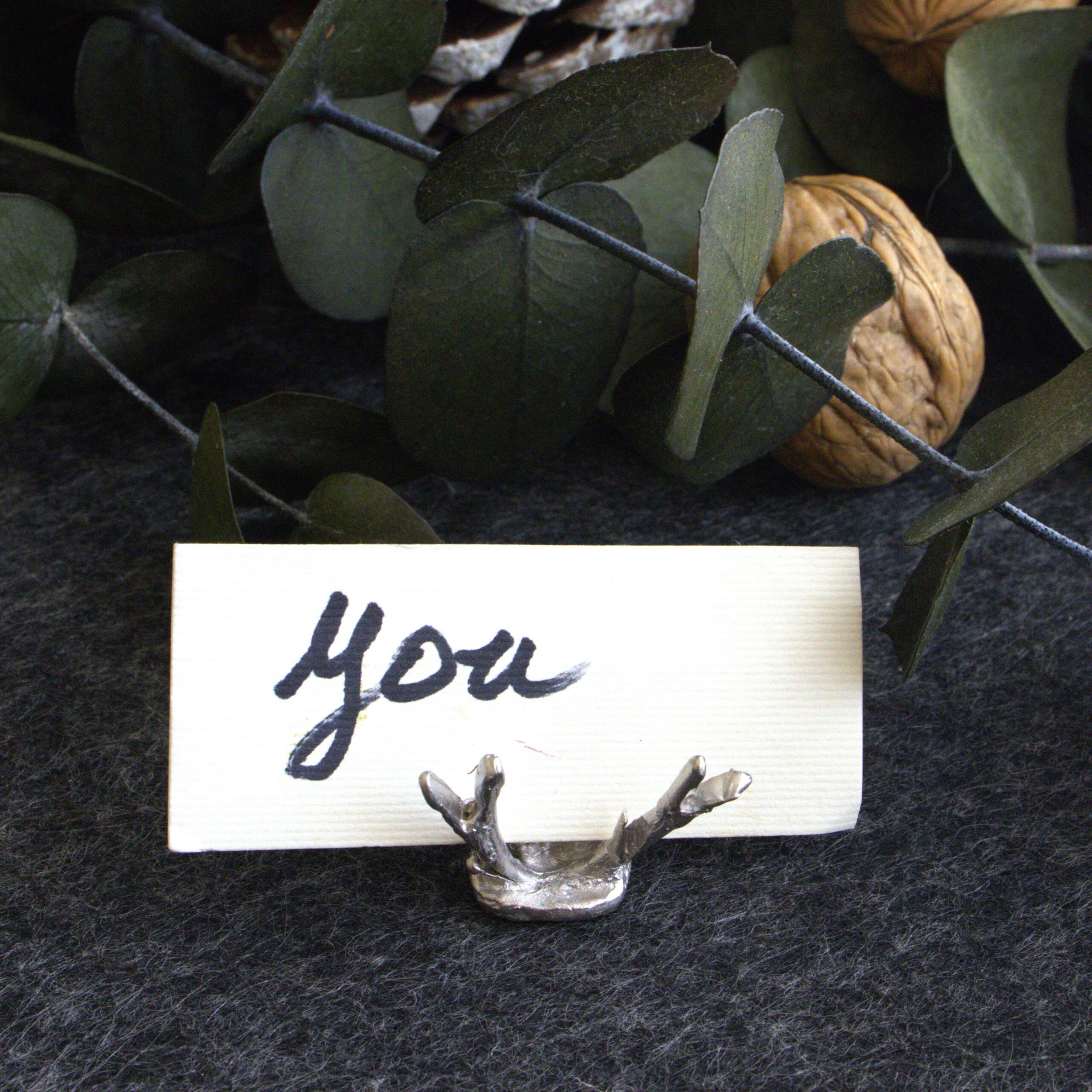 Set di segnaposto realizzati in bronzo con cartoncino in color avorio. Possibilità di finitura anche in color platino.